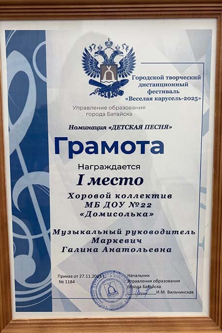 Хоровой коллектив "Домисолька" награждается грамотой за 1 место в вокальном конкурсе среди детских коллективов дошкольных учреждений города Батайска "Веселая карусель - 2025" в номинации "Детская песня". Музыкальный руководитель - Маркевич Галина Анатольевна.